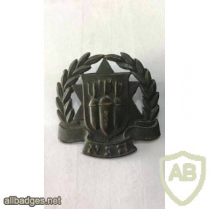 סמל כובע הג"א ( הגנה אזרחית ) גירסא- 3. הסמל מושחם ועליו מגן העשוי מחלק נפרד המחובר אליו.